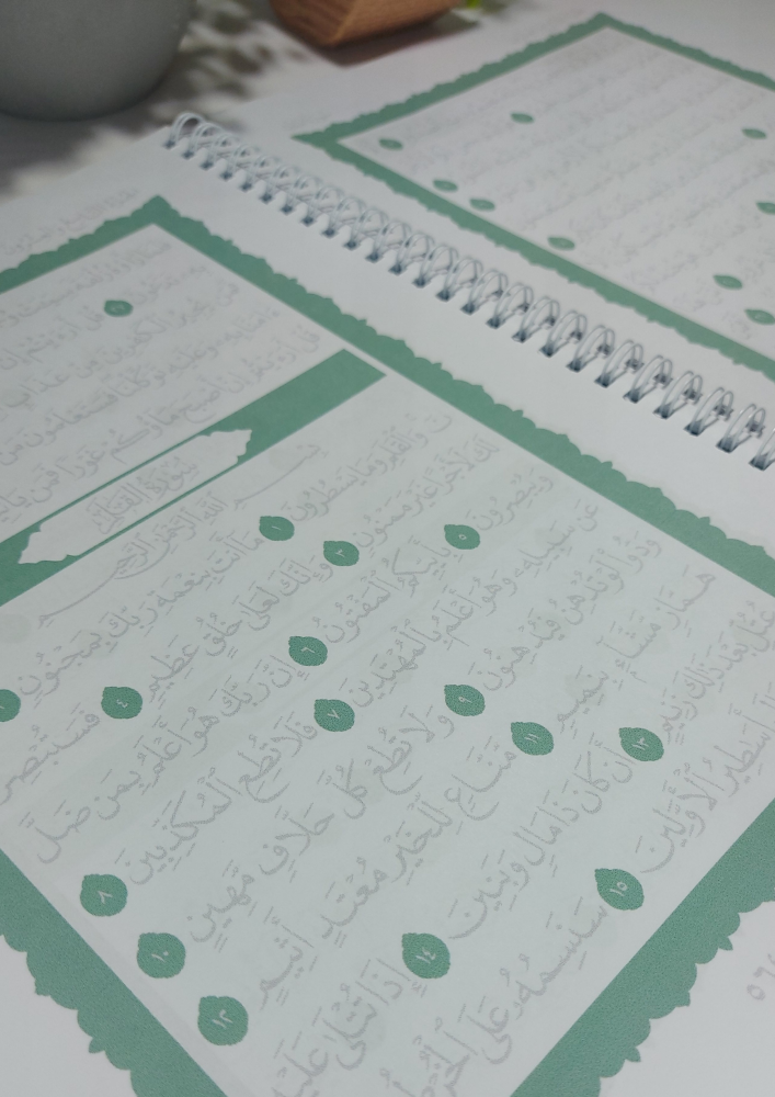ولاكن لون الآيات باهت حتى تكون قادر على الكتابة عليها بخط يدك وبذلك تُحسن كتابتك وحفظ القرآن.