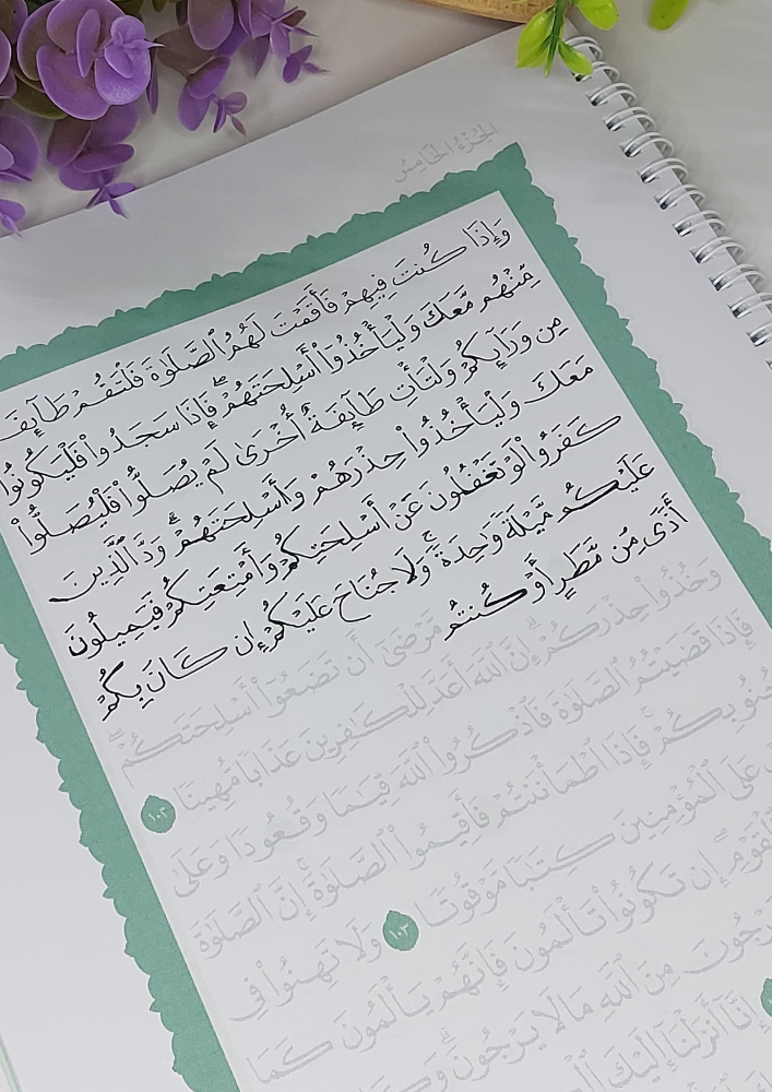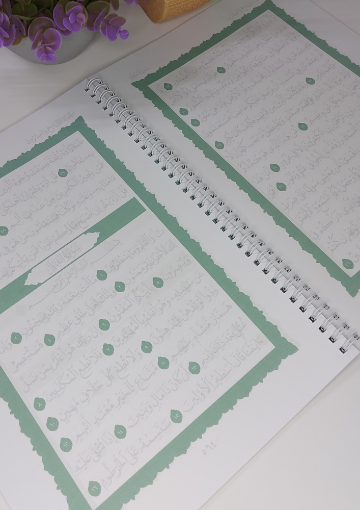 ولاكن لون الآيات باهت حتى تكون قادر على الكتابة عليها بخط يدك وبذلك تُحسن كتابتك وحفظ القرآن.